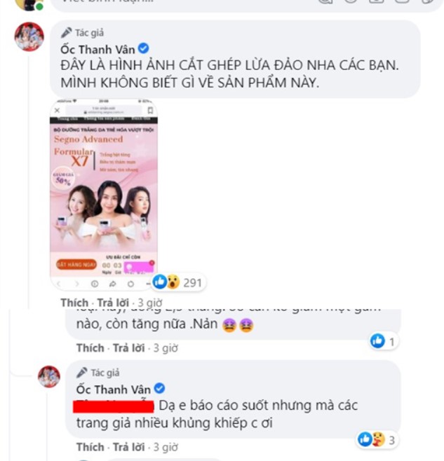 Theo đó, vì hiểu nhầm các trang giả mạo Ốc Thanh Vân, đăng tải lại các clip bán hàn rồi bán hàng giả nên nhiều cư dân mạng đã ‘chất vấn’ nữ MC. Ốc Thanh Vân cũng thẳng thắn trả lời đó hoàn toàn là tài khoản giả, bán toàn hàng nhái lại các sản phẩm mà cô đang kinh doanh. Tuy đã báo cáo, nhưng vì nhiều tài khoản giả mọc lên như nấm nên nhiều khán giả đã bị lừa. Ốc Thanh Vân đã giải thích dưới phần bình luận: “Mình rất tiếc vì kẻ xấu quá nhiều, mình không làm gì được. Xin lỗi bạn.”