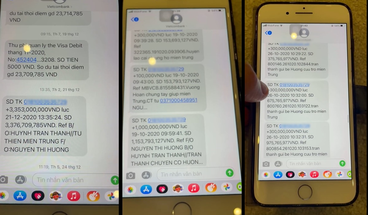 -Đợt 2: Lúc đó cô Ngọc Hương đang trực tiếp đi cứu trợ ngoài miền Trung, chưa nhận được hồi âm của Thuỷ Tiên, tôi đành quyết định chuyển gấp cho cô thêm 2.100.000.000đ (vì không ra được ngân hàng nên tôi phải chuyển khoản bằng mobile banking 300.000.000đ / lần. Chuyển đúng 7 lần là 2.100.000.000đ. Tôi sẽ in sao kê, có ghi rõ nội dung chuyển rõ ràng cho quý vị xem)