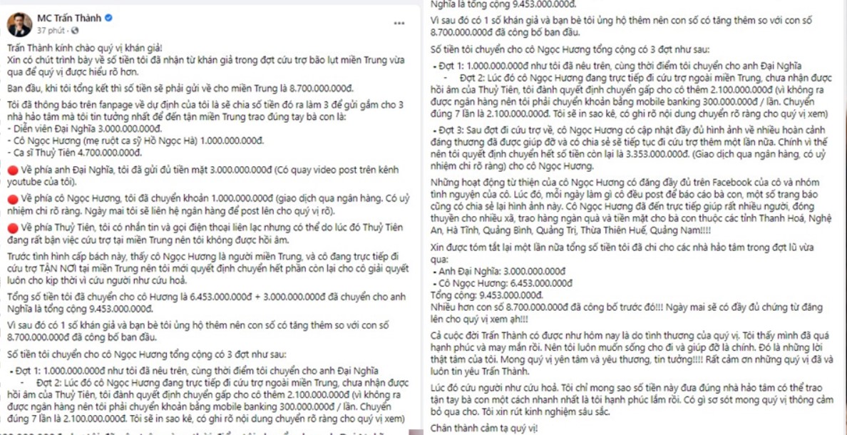 Theo đó, theo như kế hoạch ban đầu, Trấn Thành sử dụng 8.7 tỷ tiền kêu gọi cứu trợ bão lụt miền Trung (theo thống kê ban đầu) để gửi cho 3 nghệ sĩ mà anh đặt niềm tin là: nam MC Đại Nghĩa, Thủy Tiên, mẹ ruột ca sỹ Hồ Ngọc Hà là cô Ngọc Hương.
