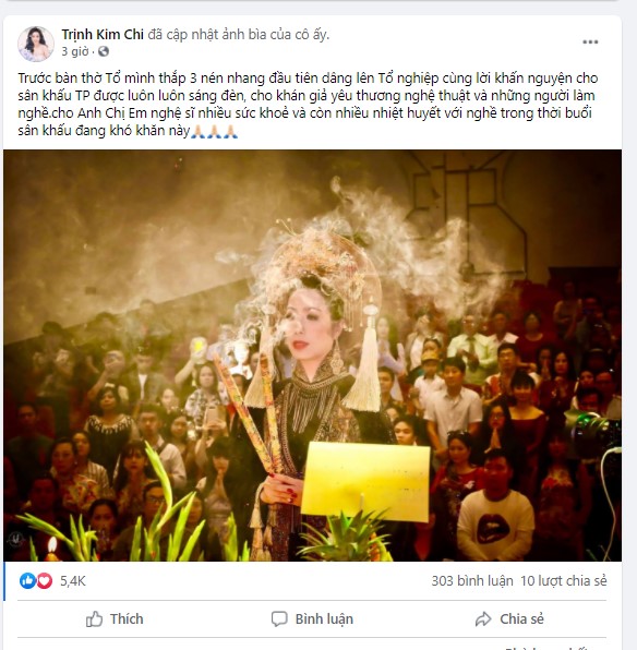 Mới đây, vào ngày 20/5, nữ NSƯT Trịnh Kim Chi đã đăng tải một hình ảnh vô cùng đặc biệt khi dâng hương lên bàn thờ tổ nghiệp sân khấu với những dòng mô tả đầy xúc động: