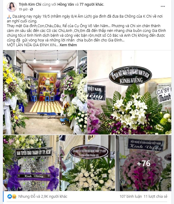 Bài đăng của nghệ sĩ Trịnh Kim Chi xuất hiện trong thời điểm cô vừa chịu tang cha chồng và đưa ông về nơi an nghỉ cuối cùng vào tang lễ ngày 9/5 (ngày 8/4 âm lịch). Trước đó nữ ca sĩ cũng đã vô cùng đau buồn báo tin tang sự trên trang cá nhân.