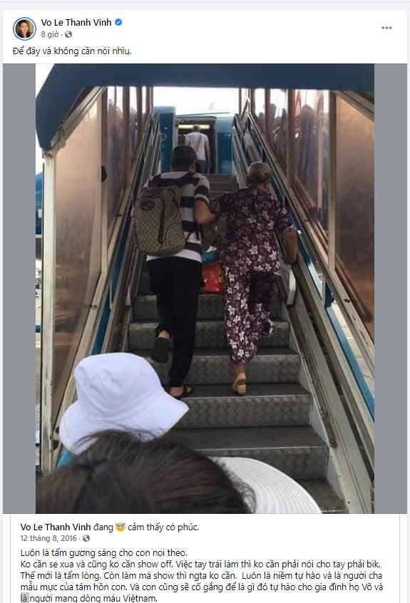 Cụ thể, con trai Hoài Linh đã chia sẻ một hình ảnh từ 2016 khi Hoài Linh đã dìu một người già khi đi lên cầu trang của máy bay. Điều này thể hiện sự tự hào, niềm tin của Thành Vinh về đạo đức cũng như tình yêu thương cộng đồng của NS Hoài Linh.