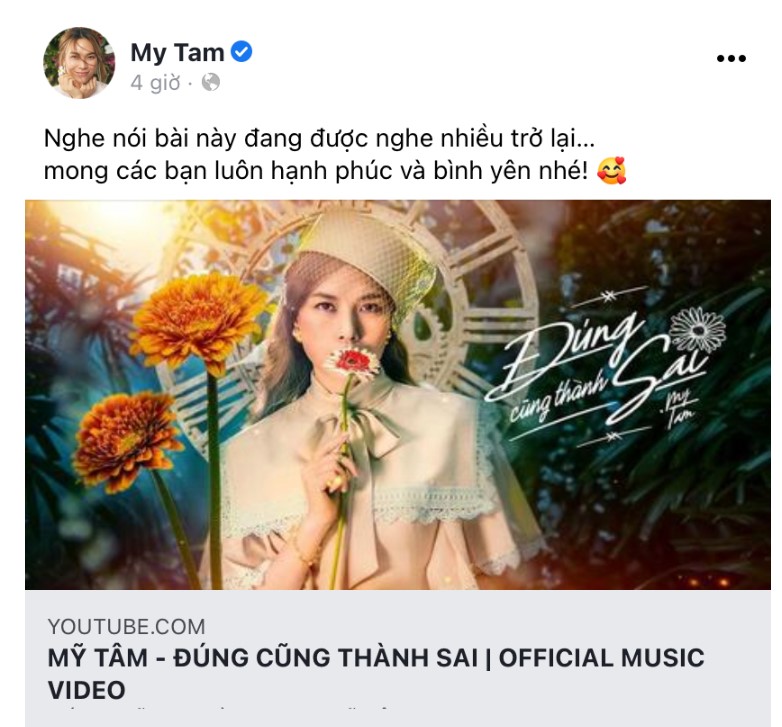 Trong khi câu chuyện giữa Đông Nhi và fan vẫn đang là tâm điểm của mọi sự bàn tán thì ở một diễn biến khác, Mỹ Tâm khiến người hâm mộ vô cùng phấn khích khi bất ngờ chia sẻ lại bài hát “Đúng cũng thành sai”.