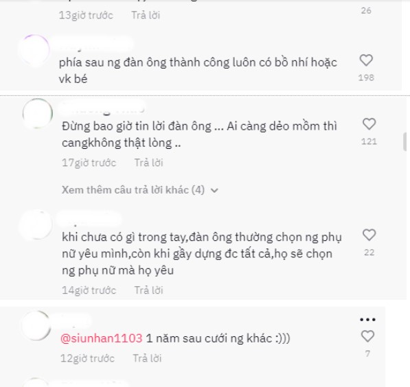 "Giàu rồi bội bạc ! Chị ấy lớn tuổi rồi thì thanh Xuân hết rồi thì ông đi lấy gái trẻ ! Thương chị"