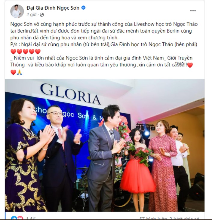 "Ngọc Sơn vô cùng hạnh phúc trước sự thành công của Liveshow học trò Ngọc Thảo tại Berlin.Rất vinh dự được đón tiếp ngài đại sứ đặc mệnh toàn quyền Berlin cùng phu nhân đã đến tặng hoa và xem chương trình.