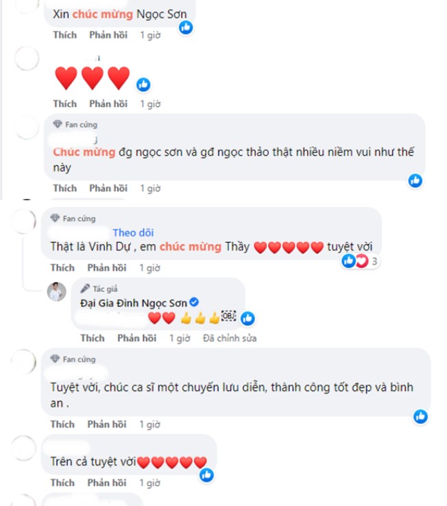 Ngay dưới bài đăng, khán giả nồng nhiệt gửi lời chúc mừng đến danh ca Ngoc Sơn và ca sĩ Ngọc Thảo: