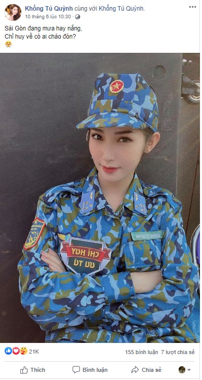 Dưới bức ảnh đăng tải trong màu áo hải quân, Khổng Tú Quỳnh đã nhận được những lời khen của người hâm mộ: “Chị chỉ huy xinh quá!”, “Đang hóng tập có chị đây ạ!”, “Lính biển thế này cá chết hết..không dám lên mặt nước.”