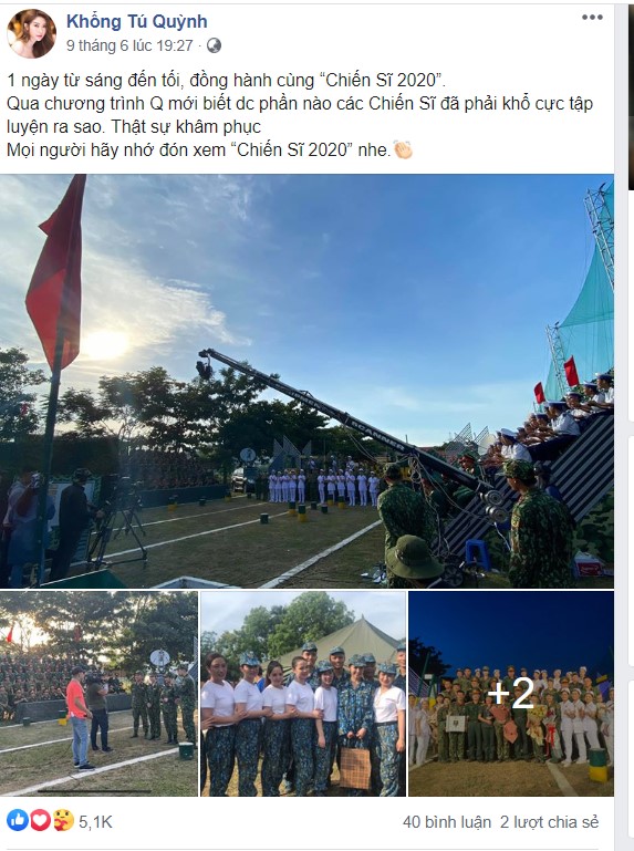 Mới đây, Khổng Tú Quỳnh đã bất ngờ khoe hình ảnh mặc quân phục. Trước đó, nữ ca sĩ cho hay cô đã dành một ngày để đồng hành cùng “Chiến Sĩ 2020”. Nữ ca sĩ cho hay nhờ chương trình này, cô mới biết được phần nào các Chiến Sĩ đã phải khổ cực tập luyện ra sao.