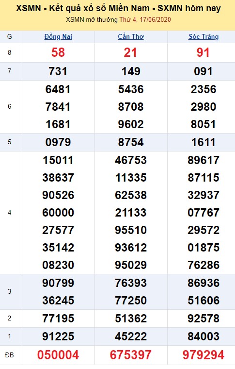 Dưới đây là kết quả XSMN xổ số miền Nam (Xổ số kiến thiết miền Nam) hôm nay thứ 4 ngày 17/6/2020 bao gồm sổ xố của 3 tỉnh thành: Đồng Nai, Cần Thơ, Sóc Trăng.