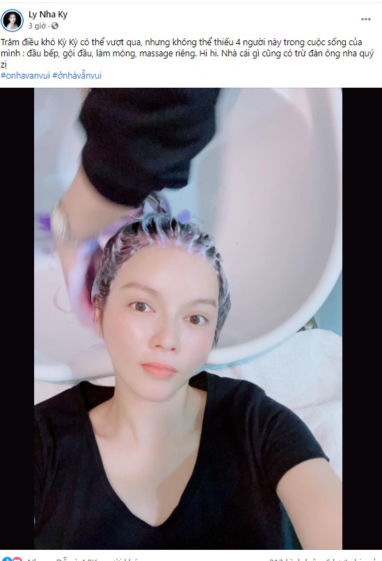 Bà hoàng kim cương chia sẻ trên trang cá nhân: “Trăm điều khó Kỳ Kỳ có thể vượt qua, nhưng không thể thiếu 4 người này trong cuộc sống của mình: đầu bếp, gội đầu, làm móng, massage riêng. Hi hi. Nhà cái gì cũng có trừ đàn ông nha quý vị”