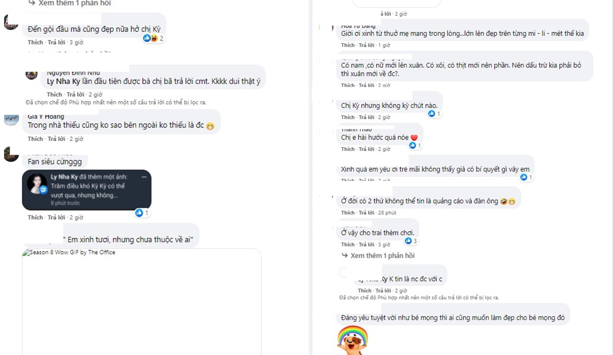 Nhiều cư dân mạng phải khen ngợi và xuýt xoa trước gương mặt mộc đầy trẻ trung của Lý Nhã Kỳ: “Đến gội đầu mà cũng đẹp nữa hở chị Kỳ”, “Giời ơi xinh từ thuở mẹ mang trong lòng...lớn lên đẹp trên từng mi- li - mét thế kia”, “Lúc nào chi kỳ đẹp gái hết!”, “Đáng yêu quá chị kỳ ơi!”, “Bé mọng đáng yêu hết nức!”