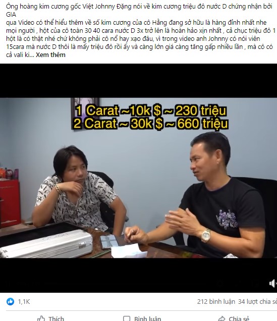 Ngay lập tức đoạn clip Johnny Đặng phân tích giá trị thật của kim cương mà các đại gia ở Việt Nam ‘chơi’ đã nhận được sự chú ý của khán giả.