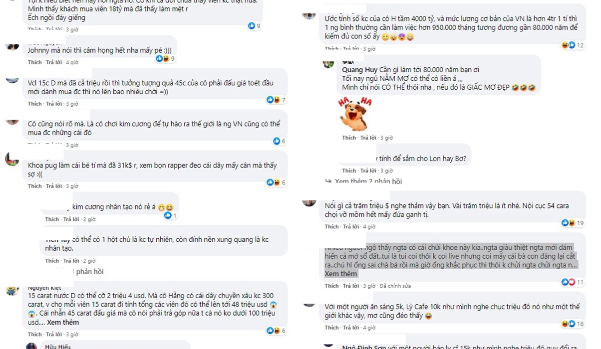 Nhiều cư dân mạng cũng thể hiện bức xúc trước những ý kiến nghi ngờ về giá trị thực của số kim cương mà bà Hằng đồng thời sửng sốt trước giá trị thực của những viên kim cương này sở hữu: