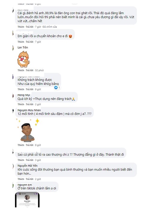 Bên cạnh đó, nhiều cư dân mạng vẫn phản đối việc cô gái có những phát ngôn khó chấp nhận trên sóng truyền hình: “Em gái đó là xấu mặt nữ giới nói chung anh ơi, quan điểm gì mà hở cái là yêu người khác, rồi giận thì chuyển khoản, rồi chỉ muốn nhận mà không muốn cho, đó là ích kỷ chứ không phải cá tính”, “Cái gì..Bênh hả anh..99,9% là đàn ông con trai ghét rồi. Thái độ quá đáng lắm luôn..muốn đòi hỏi thì phải nên biết mình là cái gì..chưa yêu đương gì đã vậy rồi. Vứt vứt vứt...chấm hết.”, “Ăn nói vô duyên làm mất mặc con gái chúng con lắm chú ơi!”