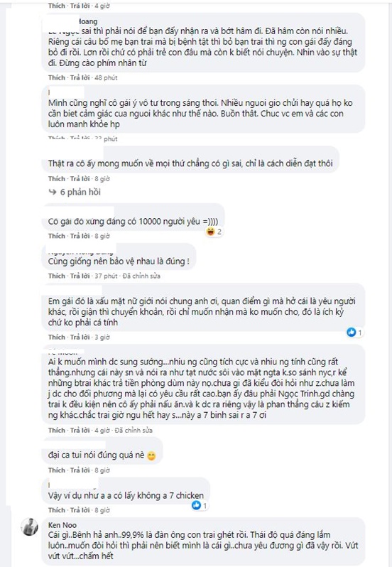 Một số ý kiến đồng ý với nam diễn viên và cho rằng cư dân mạng đã quá gay gắt với nhân vật nữ nói trên: “Trong cuộc sống phải có người này người khác đúng không anh. sao bây giờ công đồng mạng lại sống quá gay gắt như vậy nhỉ? cơ bản cũng chỉ là quan điểm sống của người khác hoặc đôi khi vì là tuổi trẻ chưa trải sự đời nói mà chưa suy nghĩ. Em cũng từng có thời tuổi trẻ đầy yêu cầu và cuối cùng gặp 1 người trớt quớt không giống gì với hình mẫu của mình.”; “Mình cũng nghĩ cô gái ý vô tư trong sáng thôi. Nhiều người giờ chửi hay quá họ không cần biết cảm giác của người khác như thế nào. Buồn thật.”