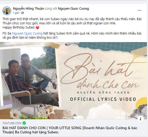 Theo đó, vào sáng 21/6, nhạc sĩ Nguyễn Hồng Thuận đã đăng tải một video bài hát mà đích thân Cường Đô La dành tặng cho Subeo. Bài hát này được đăng tải trên kênh youtube của nhạc sĩ Nguyễn Hồng Thuận vào đúng dịp sinh nhật của con trai Cường Đô La và còn đi kèm những hình ảnh ngọt ngào của hai bố con.