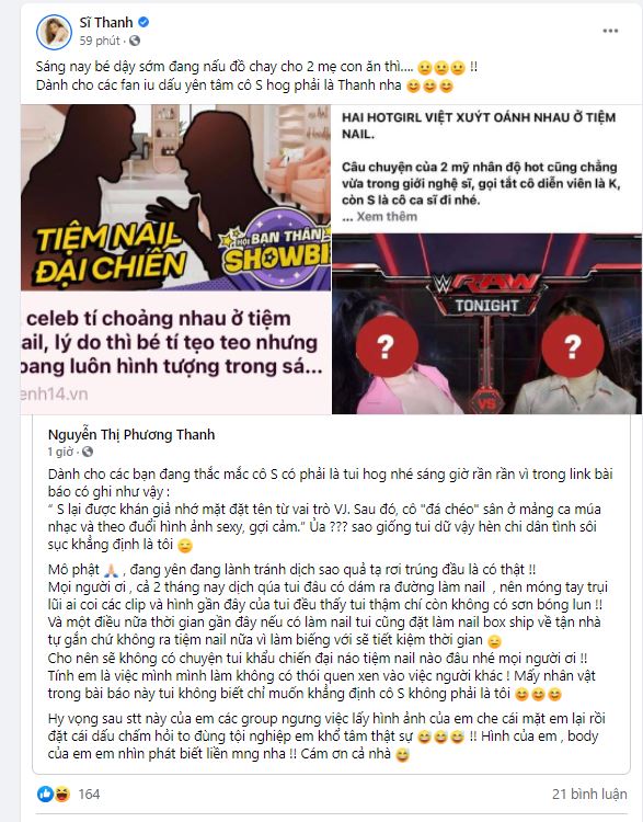 Về phía Sĩ Thanh cô cùng cho rằng những tin đồn trên là hoàn toàn sai sự thật : “Mọi người ơi, cả 2 tháng nay dịch qua tui đâu có dám ra đường làm nail , nên móng tay trụi lủi ai coi các clip và hình gần đây của tui đều thấy tui thậm chí còn không có sơn bóng lun !! Và một điều nữa thời gian gần đây nếu có làm nail tui cũng đặt làm nail box ship về tận nhà tự gắn chứ không ra tiệm nail nữa vì làm biếng với sẽ tiết kiệm thời gian.