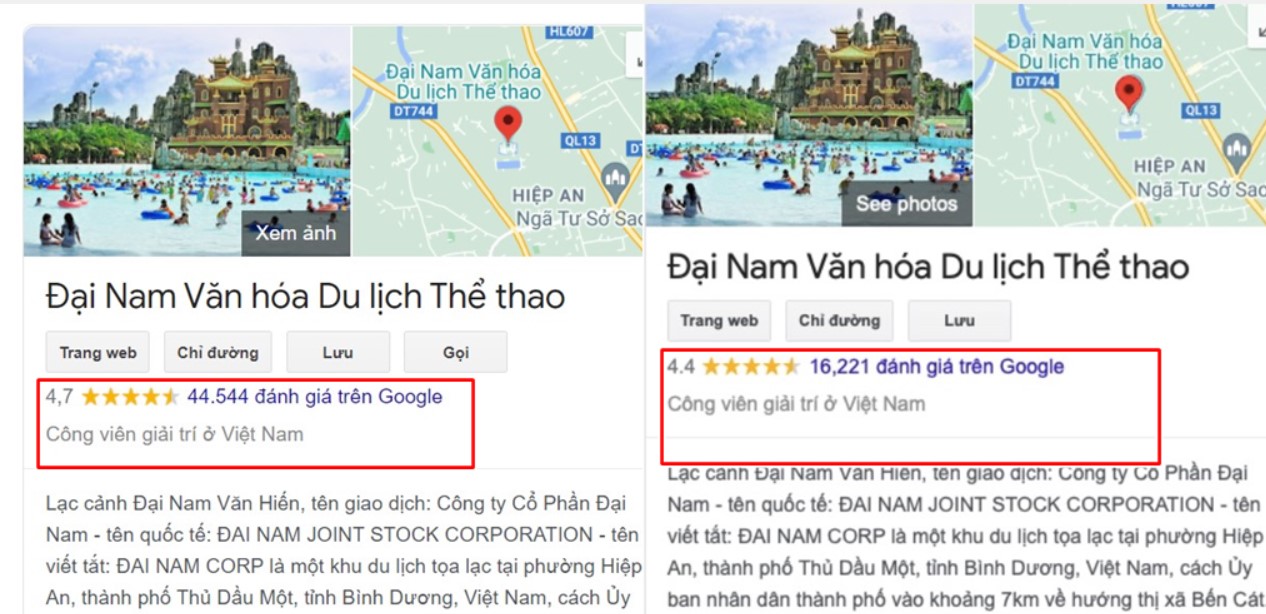 Đến ngày 1-6, khu du lịch Đại Nam nhận "bão" đánh giá 5 sao trên Google Maps, với số điểm trung bình hơn 4.7 sao cùng 44.551 đánh giá trong khi con số này vào 1 ngày trước đó chỉ dừng ở 4,4 sao vào hơn 16.000 đánh giá. Có thể thấy chỉ sau 1 đêm, đã có xấp xỉ 30.000 lượt đánh giá mới cho khu du lịch Đại Nam sau màn livestream đẫm tâm sự của bà Hằng.