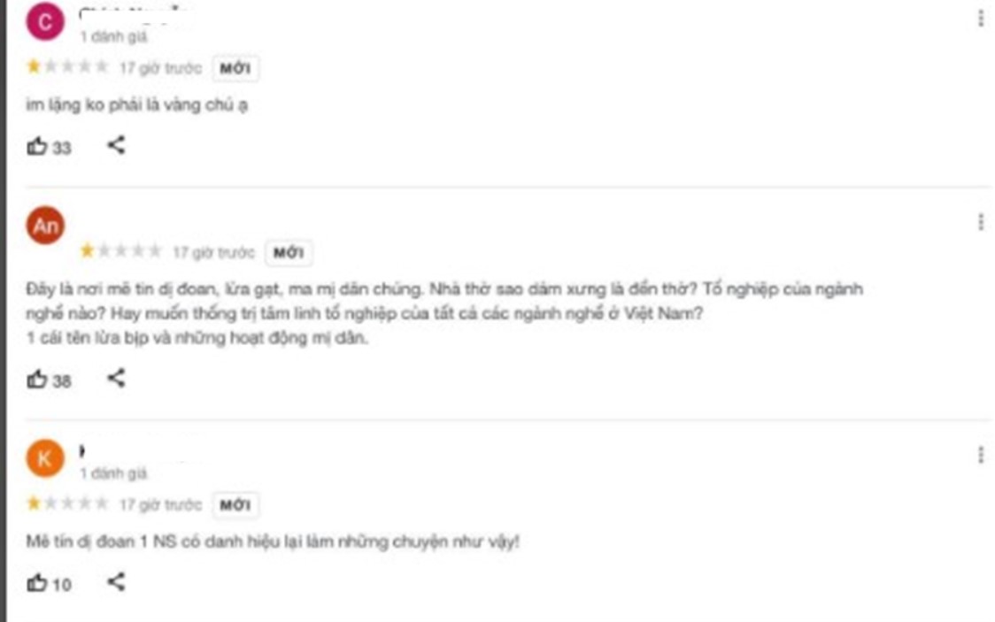 Theo đó, vào tối ngày 1-6, địa điểm Đền thờ Tổ nghiệp - Tâm linh Việt đã bị rơi xuống điểm đánh giá trung bình còn 1.3 sao trên google với hơn 60.000 lượt đánh giá khi nhiều cư dân mạng đã thi nhau vào đánh giá 1 sao cho địa điểm này với lý do ‘tẩy chay’ nam danh hài.
