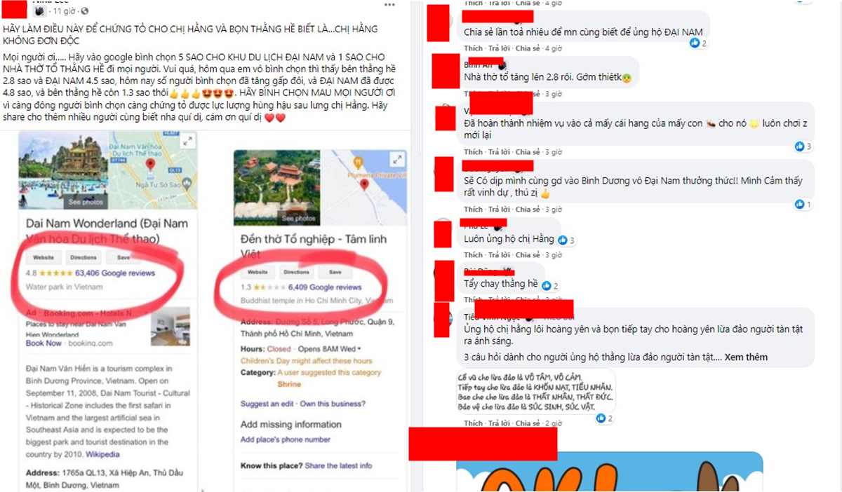 Một bài đăng trên facebook kêu gọi: “Mọi người ơi….. Hãy vào google bình chọn 5 SAO CHO KHU DU LỊCH ĐẠI NAM và 1 SAO CHO NHÀ THỜ TỔ THẰNG HỀ đi mọi người. Vui quá, hôm qua em vô bình chọn thì thấy bên thằng hề 2.8 sao và ĐẠI NAM 4.5 sao, hôm nay số người bình chọn đã tăng gấp đôi, và ĐẠI NAM đã được 4.8 sao, và bên thằng hề còn 1.3 sao thô. HÃY BÌNH CHỌN MAU MỌI NGƯỜI ƠI vì càng đông người bình chọn càng chứng tỏ được lực lượng hùng hậu sau lưng chị Hằng. Hãy share cho thêm nhiều người cùng biết nha qúy vị, cám ơn qúy vị.”
