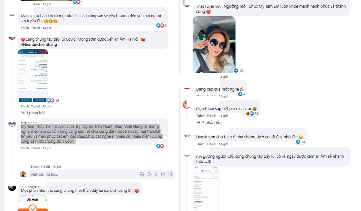 “Đẳng cấp của một nghệ sĩ.”, “Noi gương người Chị, cùng chung tay đẩy lùi cô vi, ngày được xem Tri Âm sẽ nhanh thôi ....!!!”, “Mãi mãi tự hào khi có một idol lúc nào cũng san sẻ yêu thương đến với mọi người ..mãi yêu Chị!”, “Mỹ Tâm, Thủy Tiên, Quyền Linh, Đại Nghĩa, Trấn Thành, Đàm Vinh Hưng là những nghệ sĩ có tâm có tấm lòng vàng luôn sẻ chia cùng đất nước trên các mặt trận.Rất tin yêu và mến phục các em, các cháu.Chúc các nghệ sĩ nhiều sk, nhiều niềm vui hp cùng cả nước chống dịch Covid”.