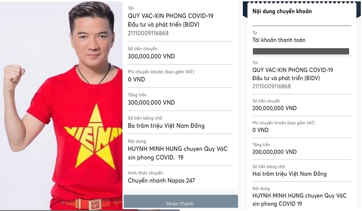 Trước đó, nhiều nghệ sĩ nổi tiếng cũng đã đóng góp vào quỹ vắc xin COVID-19 với những số tiền lớn với mong muốn truyền đi thông điệp cùng toàn dân đẩy lui dịch Covid-19:Trấn Thành (1 tỷ đồng), Đàm Vĩnh Hưng (500 triệu đồng), Đen Vâu, S.T Sơn Thạch (100 triệu đồng), Quyền Linh (2,2 tỷ) , Lý Hải – Minh Hà (100 triệu đồng)