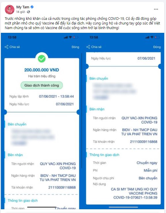Đăng tải hình ảnh chuyển khoản vào quỹ vắc xin COVID-19, Mỹ Tâm chia sẻ trên trang cá nhân: “Trước những khó khăn của cả nước trong công tác phòng chống COVID-19, Cô ấy đã đóng góp một phần nhỏ cho quỹ Vaccine để đẩy lùi đại dịch. Hãy cùng ủng hộ và chung tay góp sức để Việt Nam chúng ta sẽ sớm có Vaccine để cuộc sống sớm trở lại bình thường!”