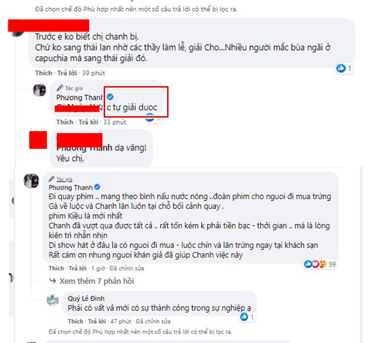 Dưới bài đăng, Phương Thanh còn tiết lộ thêm rằng cô đã từng có thời gian khi mỗi lần đi diễn phải mua trứng gà luộc rồi lăn khắp người ở ngay trường quay: “Đi quay phim .. mang theo bình nấu nước nóng ..đoàn phim cho nguoi đi mua trứng Gà về luộc và Chanh lăn luôn tại chỗ bối cảnh quay, phim Kiều là mới nhất. Chanh đã vượt qua được tất cả .. rất tốn kém k phải tiền bạc - thời gian .. mà là lòng kiên trì nhẫn nhịn