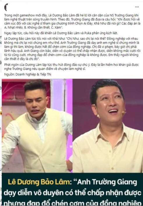 Mới đây, trong gameshow “Chọn ai đây’, Lê Dương Bảo Lâm đã gây sốt khi hé lộ lời căn dặn của NS Trường Giang khi làm nghệ thuật. Theo đó, Trường Giang đã đưa ra câu hỏi: "Khi được hỏi về cảm xúc đối với các nghệ sĩ tham gia chương trình Chọn Ai Đây, Khả Như đã nói gì? Các đáp án là A. Nhạt nhẽo, B. Không cần thiết, C. Xàm".