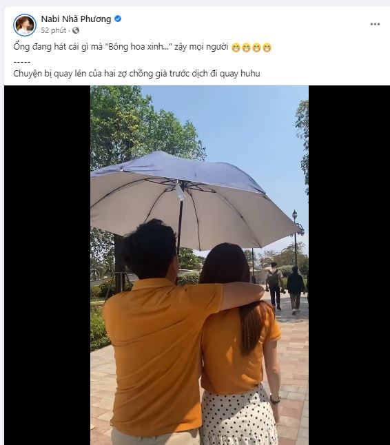 Mới đây, trên trang cá nhân của mình, Nhã Phương đã đăng tải một clip vô cùng tình cảm với Trường Giang với dòng trạng thái: “Ổng đang hát cái gì mà "Bông hoa xinh..." zậy mọi người: Chuyện bị quay lén của hai vợ chồng già trước dịch đi quay huhu”