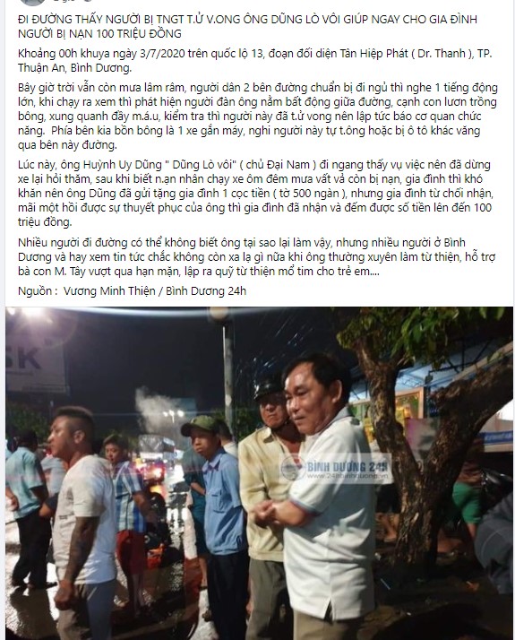 Lúc này, ông Huỳnh Uy Dũng " Dũng Lò vôi" ( chủ Đại Nam ) đi ngang thấy vụ việc nên đã dừng xe lại hỏi thăm, sau khi biết nạn nhân chạy xe ôm đêm mưa vất vả còn bị nạn, gia đình thì khó khăn nên ông Dũng đã gửi tặng gia đình 1 cọc tiền ( tờ 500 ngàn ), nhưng gia đình từ chối nhận, mãi một hồi được sự thuyết phục của ông thì gia đình đã nhận và đếm được số tiền lên đến 100 triệu đồng.
