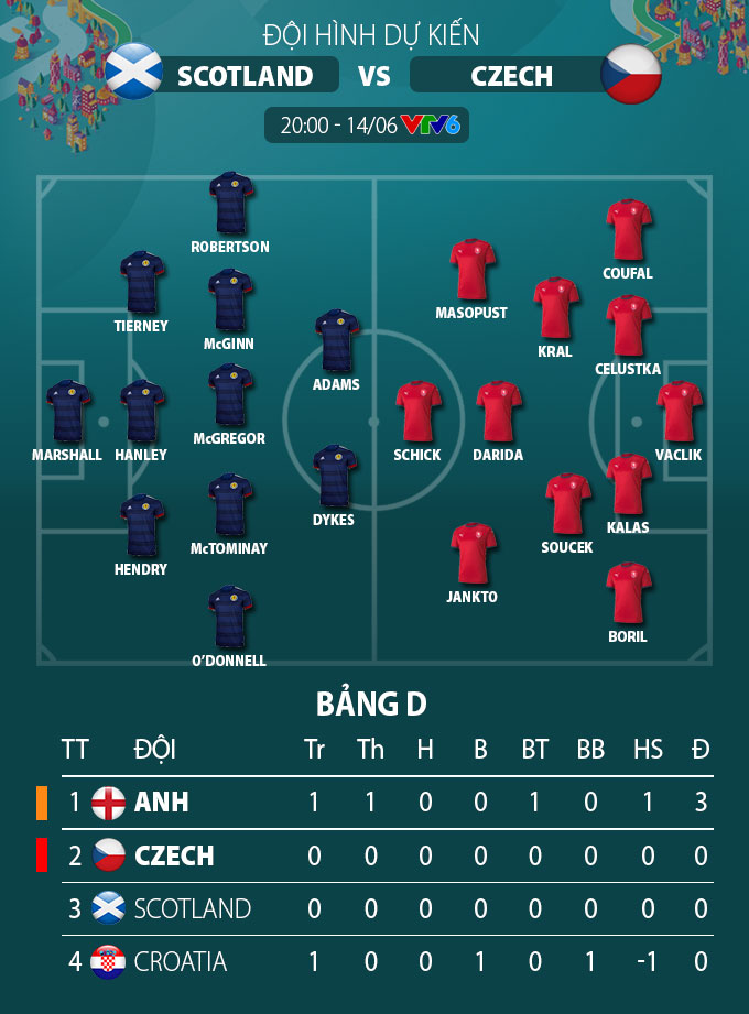 Vào 20h ngày 14/6 (giờ Việt Nam) tại sân nhà Hampden Park , ĐT Scotland sẽ có trận ra quân gặp CH Séc trong khuôn khổ bảng D EURO 2020. Trận cầu này sẽ được tường thuật trực tiếp độc quyên trên kênh VTV6 .