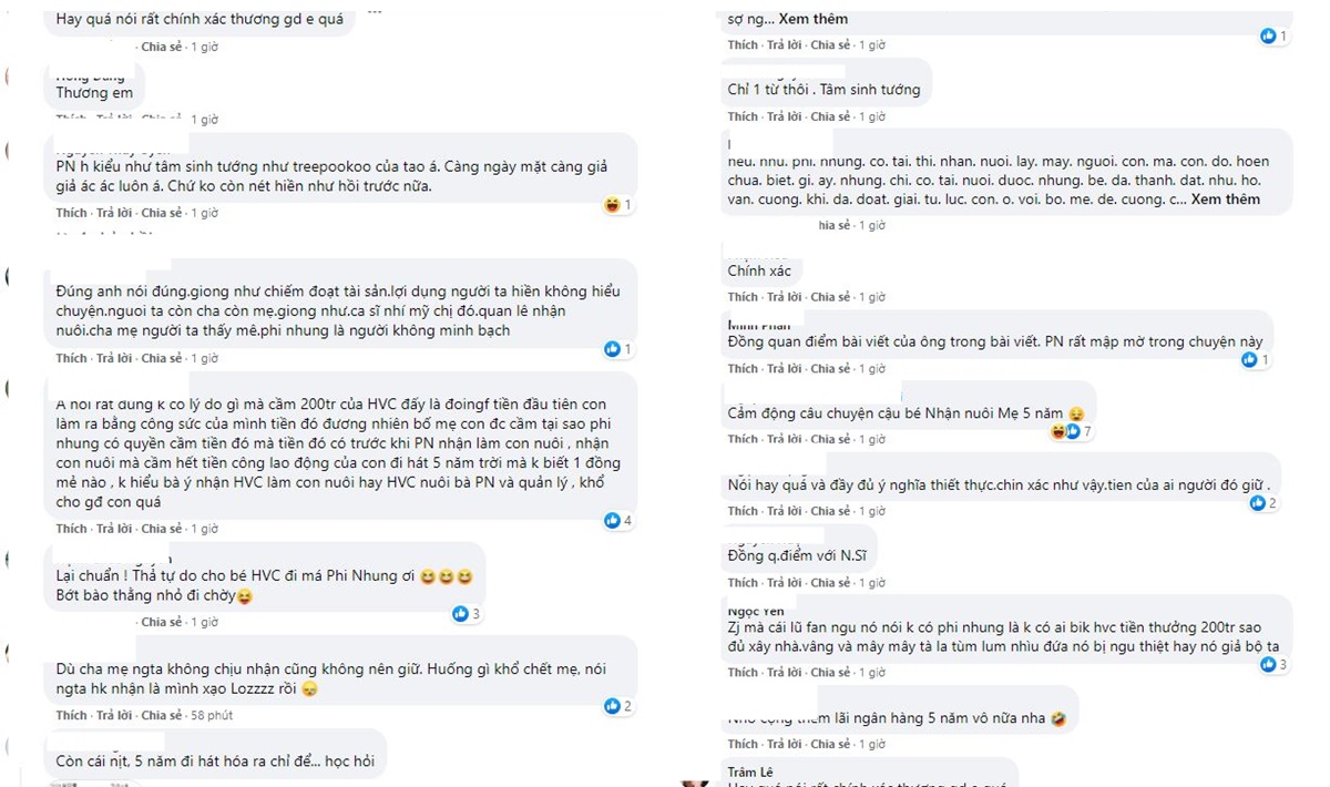 "Anh nói rất đúng, không có lý do gì mà cầm 200tr của HVC, đấy là đồng tiền đầu tiên con làm ra bằng công sức của mình. Tiền đó đương nhiên bố mẹ con được cầm. Tại sao Phi Nhung có quyền cầm tiền đó có trước khi Phi Nhung nhận làm con nuôi. Nhận con nuôi mà cầm hết tiền công lao động của con đi hát 5 năm trời."