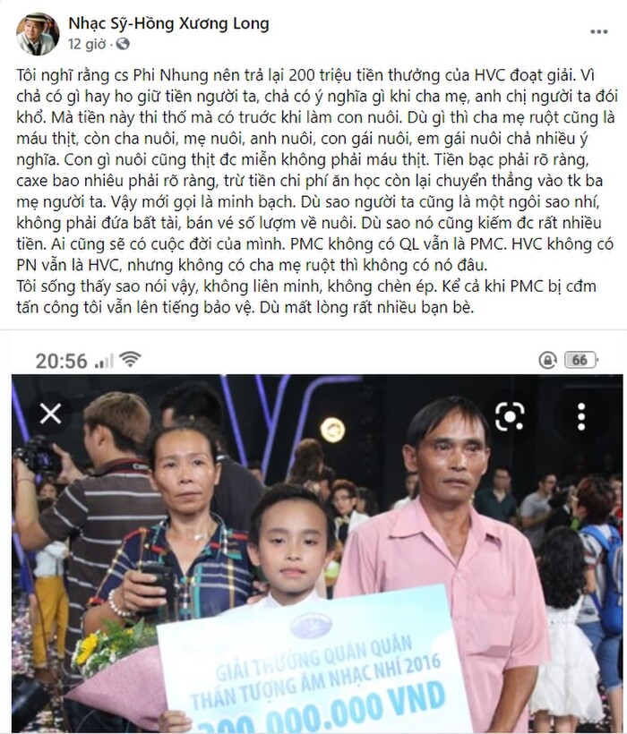 Giữa lúc lùm xùm của Phi Nhung và con nuôi đang gây tranh cãi, nhạc sĩ Hồng Xương Long - cha đẻ của một loạt hit của Cẩm Ly đã lên tiếng trên trang cá nhân với bài viết đầy tâm chua xót:"Tôi nghĩ rằng ca sĩ Phi Nhung nên trả lại 200 triệu tiền thưởng của Hồ Văn Cường đoạt giải. Vì chả có gì hay ho giữ tiền người ta, chả có ý nghĩa gì khi cha mẹ, anh chị người ta đói khổ. Mà tiền này thi thố, có trước khi làm con nuôi. Dù gì thì cha mẹ ruột cũng là máu thịt, còn cha nuôi, mẹ nuôi, anh nuôi, con gái nuôi, em gái nuôi chả nhiều ý nghĩa. Con gì nuôi cũng thịt được miễn không phải máu thịt. Tiền bạc phải rõ ràng, cát-sê bao nhiêu phải rõ ràng, trừ tiền chi phí ăn học còn lại chuyển thẳng vào tài khoản ba mẹ người ta. Vậy mới gọi là minh bạch.