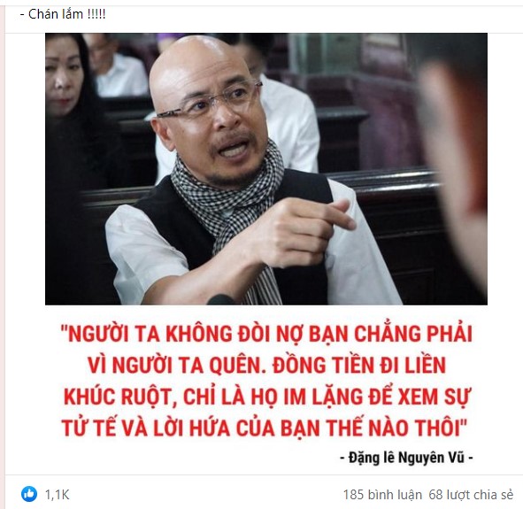 Mới đây, 1 nhóm kín có hơn 600.000 thành viên đã chia sẻ về triết lý ‘vay nợ’ của ông Đặng Lê Nguyên Vũ: “Người ta không đòi bạn cũng chẳng phải vì người ta quên. Đồng tiền đi liền khúc ruột, họ im lặng để chờ xem sự tử tế của bạn có thật như những gì bạn đã hứa hẹn.”