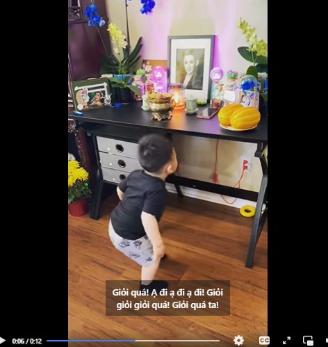 Theo đó, đoạn clip con trai nhỏ của Wendy dù chỉ mới biết đi chập chững nhưng đã có thể đứng trước bàn thờ của bà ngoại là cố ca sĩ Phi Nhung để liên tục cúi đầu thể hiện tình cảm.