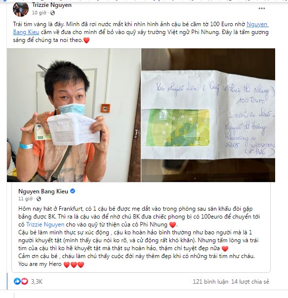 Đáng chú ý, với tư cách là người nhận số tiền, Trizzie Phương Trinh xúc động rơi nước mắt, chia sẻ lại bài viết của chồng cũ: "Trái tim vàng là đây. Mình đã rơi nước mắt khi nhìn hình ảnh cậu bé cầm tờ 100 Euro nhờ Nguyen Bang Kieu cầm về đưa cho mình để bỏ vào quỹ xây trường Việt ngữ Phi Nhung. Đây là tấm gương sáng để chúng ta noi theo."