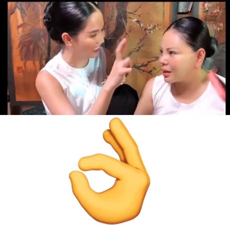 Theo đó, thay vì nói ‘Ok’ với Lê Giang thì cô nàng lại tạo biểu tượng bắt chéo ngón trỏ và ngón giữa tạo thành hình tròn dài. Thậm chí cô còn dạy cho đàn chị Lê Giang làm biểu tượng tương tự.