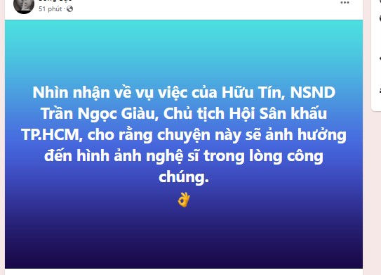 Đáng nói, chia sẻ quan điểm về ồn ào chấn động này của Hữu Tín, Chủ tịch Hội Sân khấu TP.HCM - NSND Trần Ngọc Giàu cũng cho hay sự việc này sẽ ảnh hưởng nặng nề đến hình ảnh của nghệ sĩ đến lòng công chúng:
