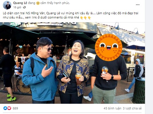 Mới đây nhất, vào tối 15/6, nam danh ca Quang Lê đã bất ngờ chia sẻ hình ảnh hội ngộ với nữ NSND Hồng Vân ở Mỹ. Đáng nói nam ca sĩ còn hé lộ thông tin đặc biệt của con trai NSND Hồng Vân với dòng trạng thái đầy mập mờ: “Lộ diện con trai NS Hồng Vân, Quang Lê vui mừng khi cậu ấy là…. Làm công việc đó mà đẹp trai như siêu mẫu.., xem link ở dưới comments cả nhà nhé”