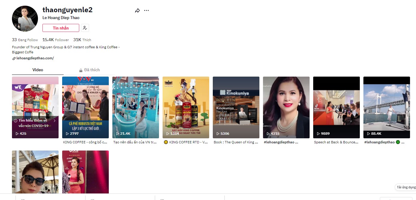 Đáng nói, trên mạng xã hội Tiktok đã xuất hiện một số tài khoản mang tên bà Hoàng Lê Diệp Thảo. Dù chưa có dấu tích xanh và xác minh chính chủ nhưng việc tài khoản này đăng tải những hình ảnh đời thường hiếm thấy cùng các hoạt động của King Coffee khiến dân tình không khỏi chú ý.