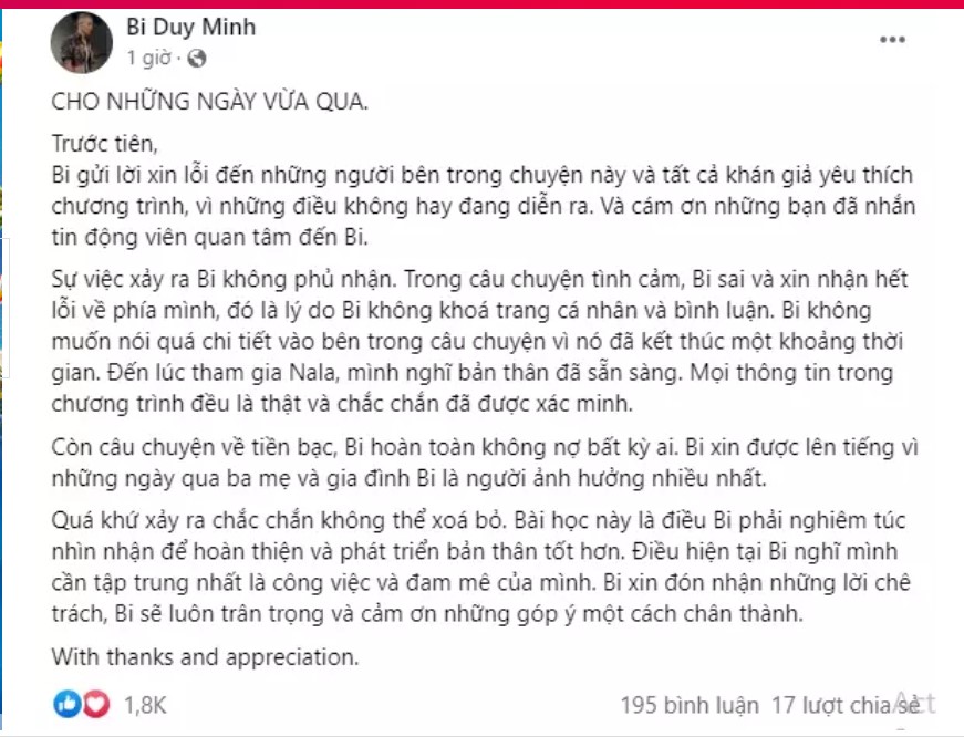 Sau 1 tuần im lặng, Duy Minh mới đây đã chính thức lên tiếng trên trang cá nhân. Anh thừa nhận mọi sai lầm về chuyện tình cảm trong quá khứ và gửi lời xin lỗi đến những khán giả theo dõi.