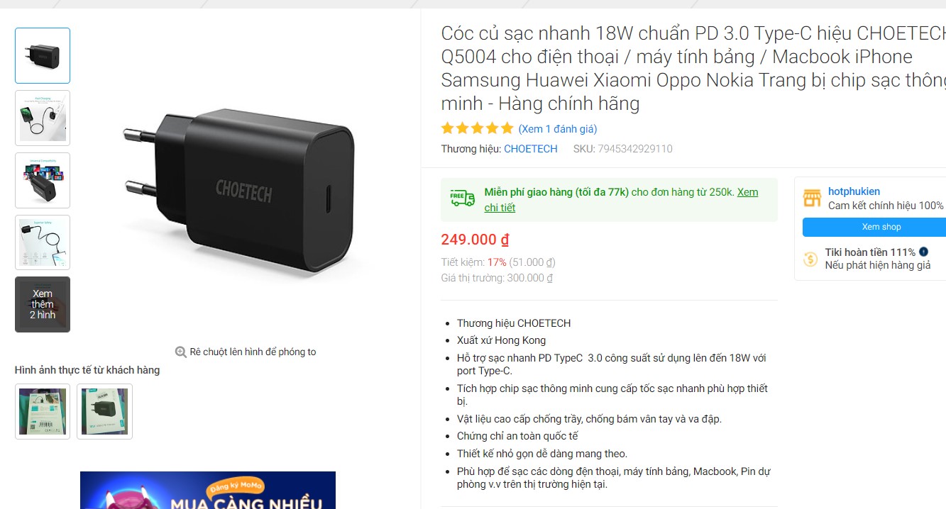 Vì vậy, Techz.vn muốn giới thiệu đến độc giả một mẫu củ sạc nhanh đến từ hãng Choetech hỗ trợ khả năng sạc nhanh USB Power Delivery (củ sạc 18W chuẩn PD 3.0 Type-C CHOETECH Q5004 ) với giá rẻ hơn nhiều.