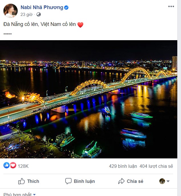 Vào ngày 27/7, Nhã Phương cũng đã đăng tải một bức ảnh của Cầu Rồng, Đà Nẵng với lời nhắn gửi đầy tình cảm: “Đà Nẵng cố lên, Việt Nam cố lên!”. Thông điệp của Nhã Phương như truyền thêm sức mạnh tinh thần để người dân Đà Nẵng và cả nước giữ vững tinh thần để cùng nhau vượt qua thời gian khó khăn này.