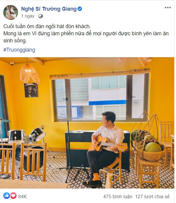 Không giấu được nỗi niềm với ‘tin dữ’ này, mới đây Trường Giang đã đăng một bức ảnh chụp trong quán Mười Khó với chú thích: “Cuối tuần ôm đàn ngồi hát đón khách. Mong là em Vi đừng làm phiền nữa để mọi người được bình yên làm ăn sinh sống”.