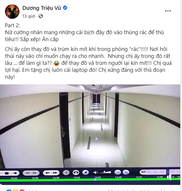 Nam ca sĩ bức xúc chia sẽ lên trang cá nhân như sau: "Sắp xếp! Ăn cắp! Chị ấy còn thay đồ và trùm kín mít khi trong phòng “rác”!!!!! Nơi hôi thúi này vào chỉ muốn chạy ra cho nhanh. Nhưng chị ấy trong đó rất lâu ... để làm gì ta?? Để thay đồ và trùm người lại kín mít!!! Chị quá lợi hại. Em tặng chị luôn cái laptop đó! Chị xứng đáng với thủ đoạn này!"