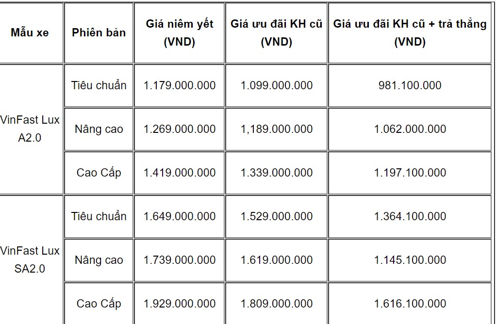 Ưu đãi này được trừ thẳng vào giá bán, áp dụng tối đa một món quà tri ân/xe và không giới hạn số lượng quà tặng cho mỗi khách hàng. Khách hàng sở hữu bao nhiêu xe VinFast sẽ nhận được lượng quà tri ân tương ứng để mua thêm xe Lux cho bản thân, hoặc tặng cho người thân, bạn bè. Theo đó, khi một khách hàng mua xe Lux sẽ nhận được 2 quà tri ân, nếu mua thêm 2 chiếc Lux SA2.0, tổng ưu đãi nhận được sẽ lên tới 240 triệu đồng.