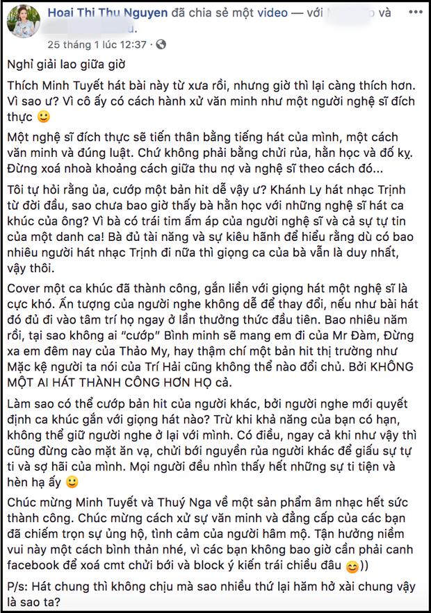Theo đó, vào đầu năm 2019, Vy Oanh và Hoa hậu Thu Hoài đã diễn ra một trận khẩu chiến gay gắt bắt đầu từ việc giọng ca ‘Đồng Xanh’ tỏ thái độ không vui vẻ khi đàn chị Minh Tuyết hát bản hit Để Cho Em Khóc của cô và cho rằng mình bị cướp hit. Điều này đã khiến Thu Hoài bức xúc và lên tiếng bảo vệ Minh Tuyết.