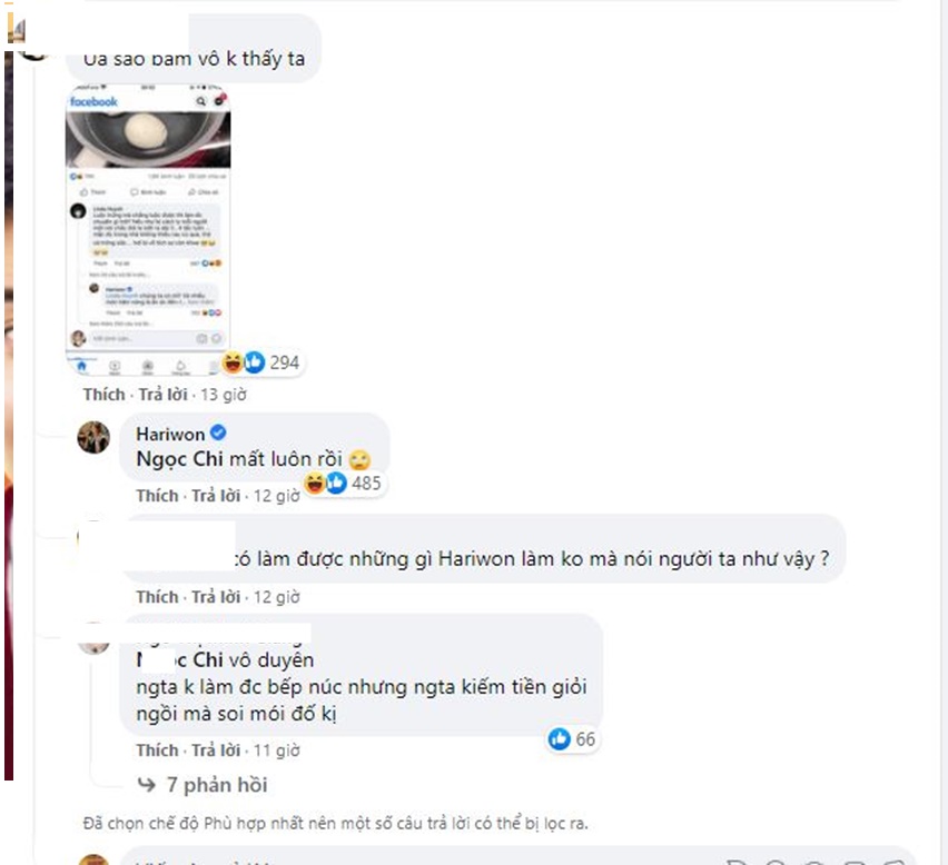 Tuy nhiên, một cư dân mạng đã chụp lại đoạn đối đáp này và thắc mắc rằng tại sao không thấy bình luận này nữa một cách đầy soi mói. Trước một câu hỏi như mượn bình luận ác ý để 'đá đểu' khả năng bếp núc của Hari Won, nữ ca sĩ cũng thẳng thắn trả lời một câu ‘xanh rờn’: ‘Mất luôn rồi’.