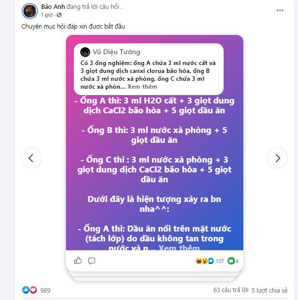 Cụ thể, một khán giả đã nhờ nữ ca sĩ giải hộ một bài hóa học nằm trong chương trình lớp 12:“Có 3 ống nghiệm: ống A chứa 3 ml nước cất và 3 giọt dung dịch canxi clorua bão hòa, ống B chứa 3 ml nước xà phòng, ống C chứa 3 ml nước xà phòng và 3 giọt dung dịch canxi clorua bão hòa. Cho vào mỗi ống nghiệm 5 giọt dầu ăn, lắc đều. Hãy dự đoán hiện tượng xảy ra và giải thích. Làm giúp em với chị”